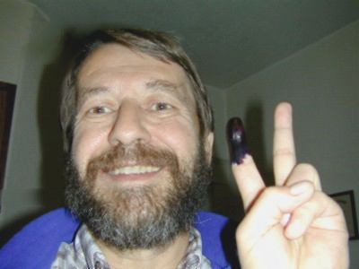 From the sublime to the ridiculous: This is the kind of crappy picture you get when you mix red and blue magic marker to simulate purple and then point the camera at yourself. On-camera flash at close distances is pretty awful, but I just had to show my support for the brave people of Iraq — and the brave Americans who made this day possible!