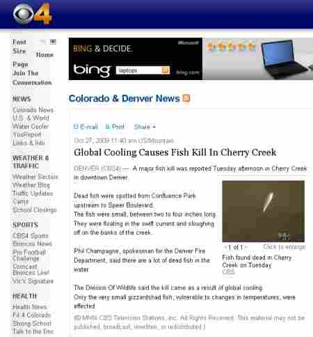 It's definitely a "man bites dog" event when a CBS-affiliated local TV news department headlines a story "Global Cooling Causes Fish Kill In Cherry Creek":