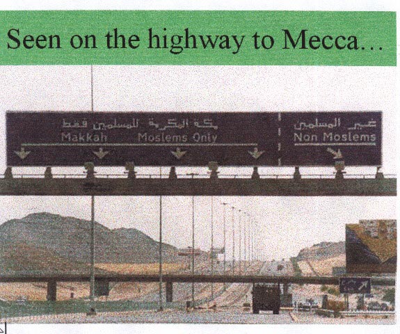 And when they say "off limits," they mean it. I believe infidels who ignore the ban and enter Mecca or Medina are beheaded. I don’t know if the tourism commission’s booklet makes that clear. Make sure your satellite navigation system is reliable. Taking the wrong exit could get you killed.